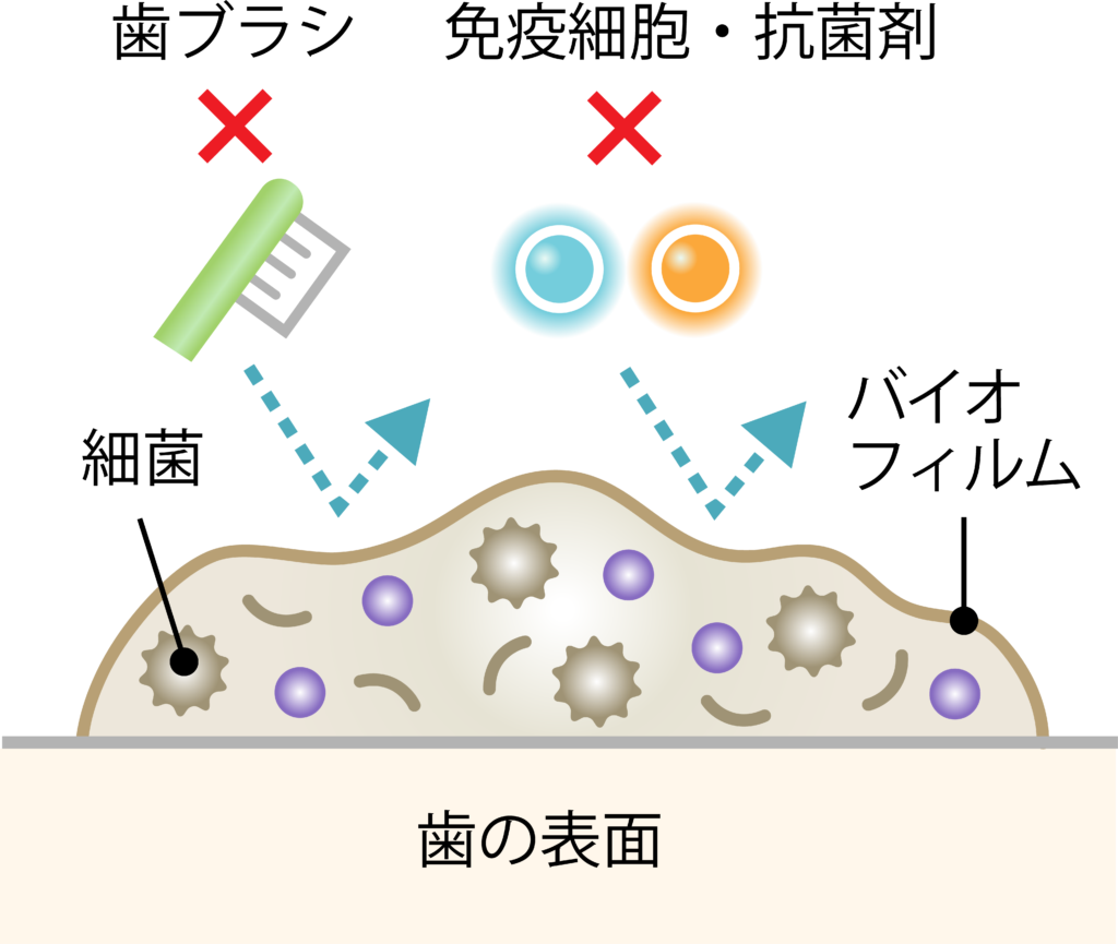 むし歯や歯周病の原因菌も、このバイオフィルムとなって、歯の表面にしっかりとこびりついています。