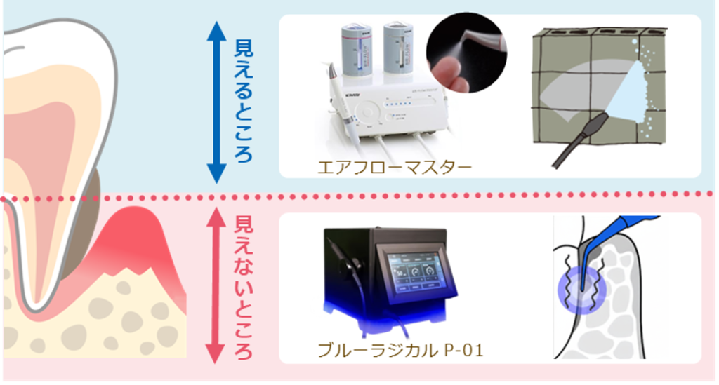 当院では、高圧の微粒子を吹き付けて汚れを落とす「エアフローマスター」と、超音波振動を使い青色レーザーと過酸化水素を同時に照射する「ブルーラジカル」で、歯肉の上(見えるところ)は「エアフローマスター」、歯肉の下(見えないところ)は「ブルーラジカル」の二刀流でしつこいバイオフィルムを効果的に除去していきます。